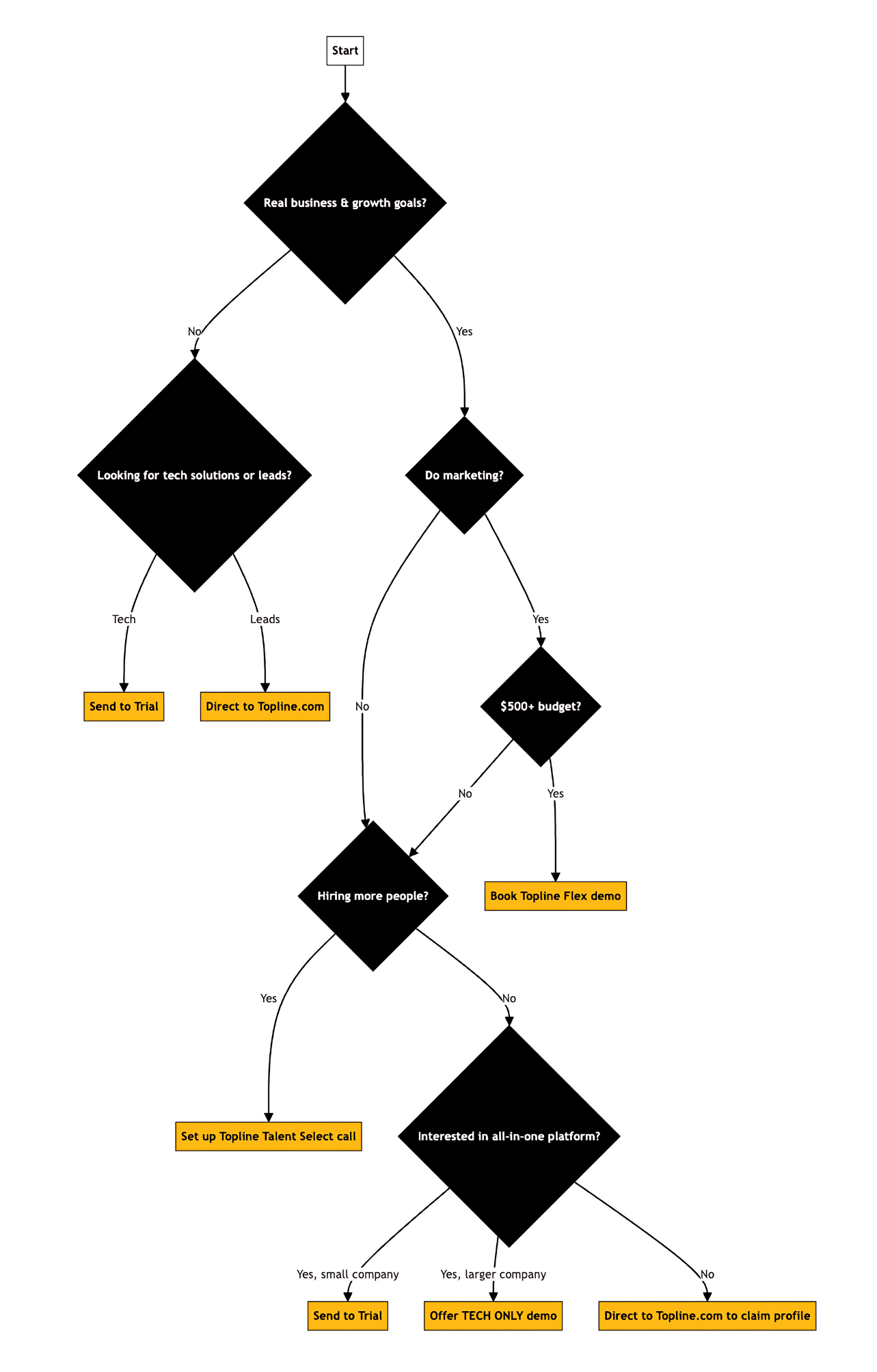 This document outlines the step-by-step process for qualifying leads at Topline. It provides a consistent framework for assessing potential clients and determining the most appropriate next steps. For a visual representation of this process, please refer to the accompanying "Topline Lead Qualification Tree" diagram, which offers the best way to understand the Topline qualification flow at a glance.