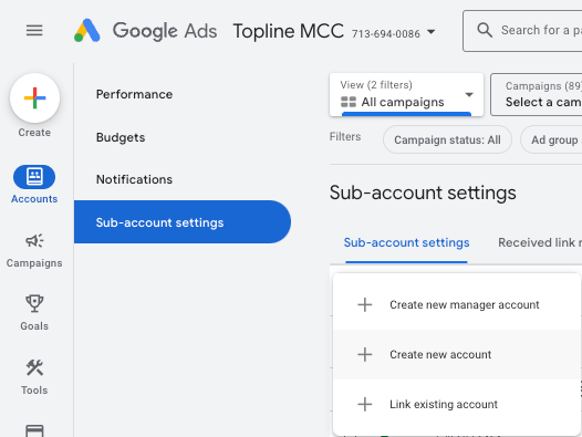 In the Google Ads Manager dashboard, click on the Accounts icon (Square icon) in the upper-left corner of the page.