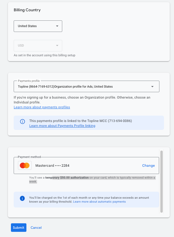 Add the payment method As follows: Billing Country: United States , Payment Profile: Topline (8664-7169-6312) And payment method: Mastercard *2284.