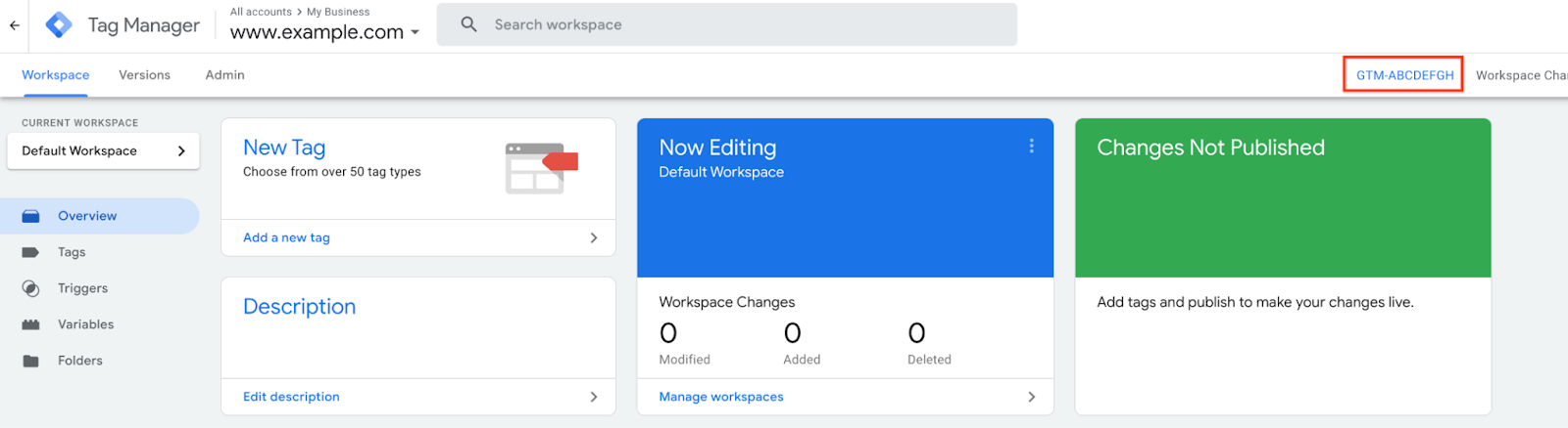 In the Workspace tab, select your container ID (which starts with 'GTM').